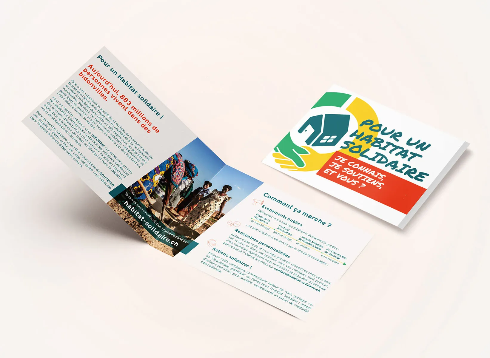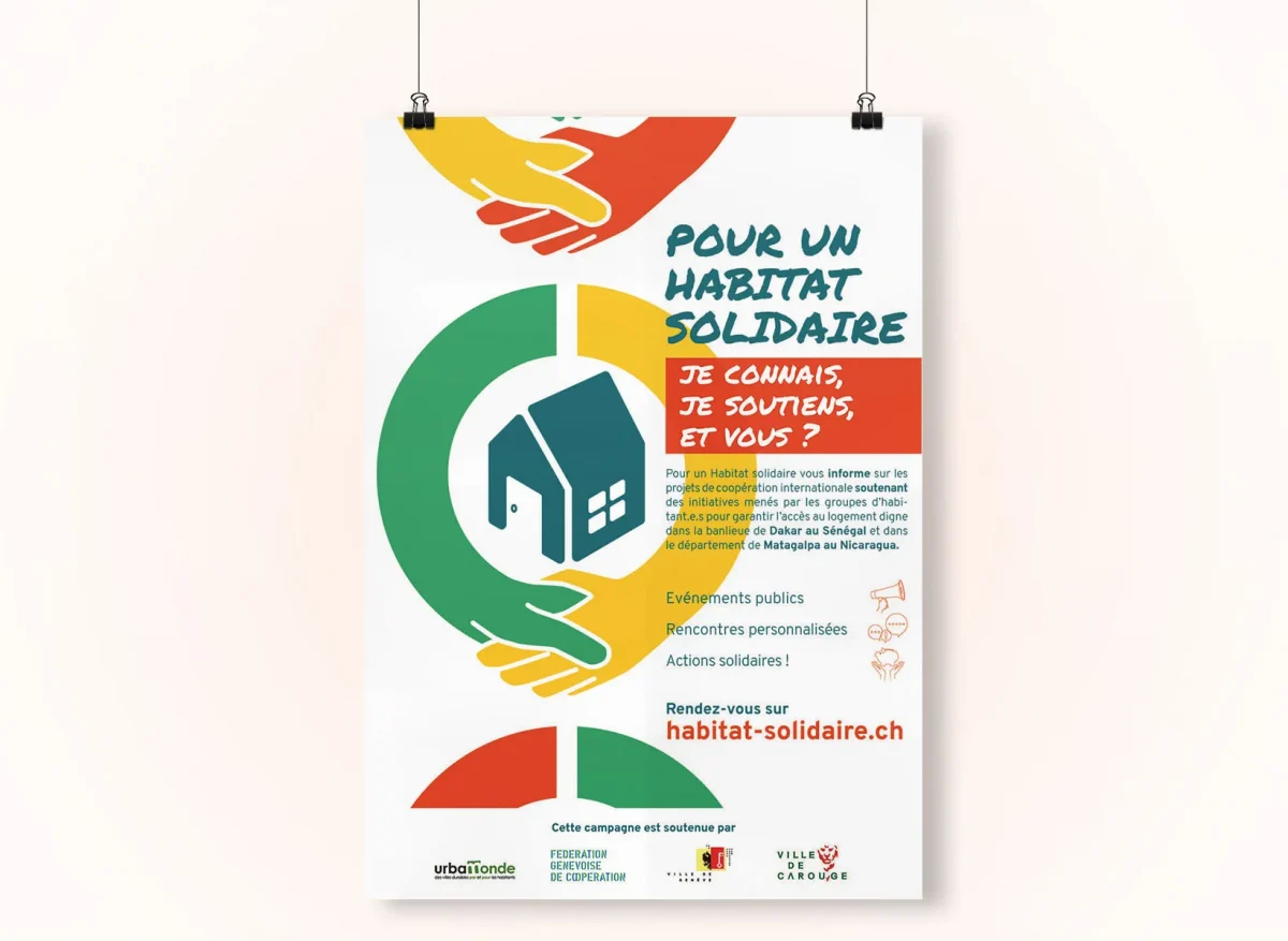 To raise awareness among the general public about the right to quality housing around the world, the “Genève Habitat Solidaire” campaign needed a strong visual identity and impactful communication materials. Bright colours and bold typography express the urgency of action. The logo, which represents hands united to create a thread of solidarity, can be adapted in different colours and even animated as a GIF for greater visibility.