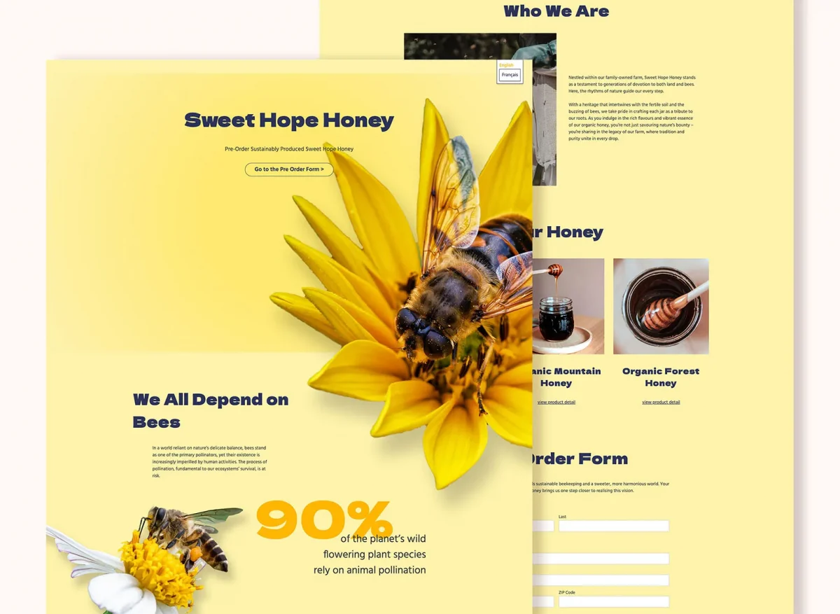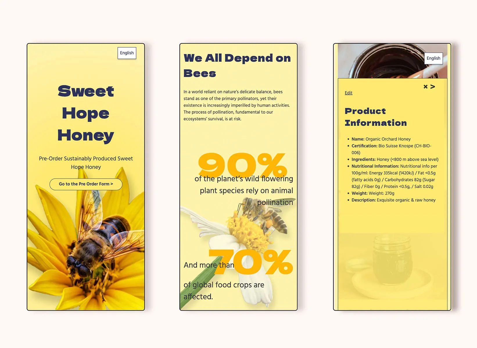 The concept for this landing page relied on a vibrant and eye-catching visual aesthetic. Every element of the page communicates the importance of supporting environmentally friendly practices while presenting Sweet Hope honey as a sustainable and responsible solution.